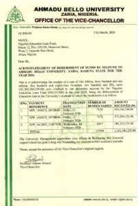 A wata takarda mai ɗauke da kwanan wata 17 ga Maris, 2026, ofishin mataimakin shugaban jami’ar ya bayyana cewa kuɗin sun kai naira biliyan 1,301,584,250, wanda aka tura cikin asusun jami’ar a matsayin lamunin ilimi ga ɗalibai.