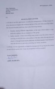 “Ina so in yi amfani da wannan dama domin sanar da hukumar gudanawar kungiyar Wikki Tourists F.C game da shawarar da na yanke na yin murabus daga matsayina na babban mai horaswa (Technical Adviser) na kungiyar, tun daga 09/02/2026 “inji Maikaba